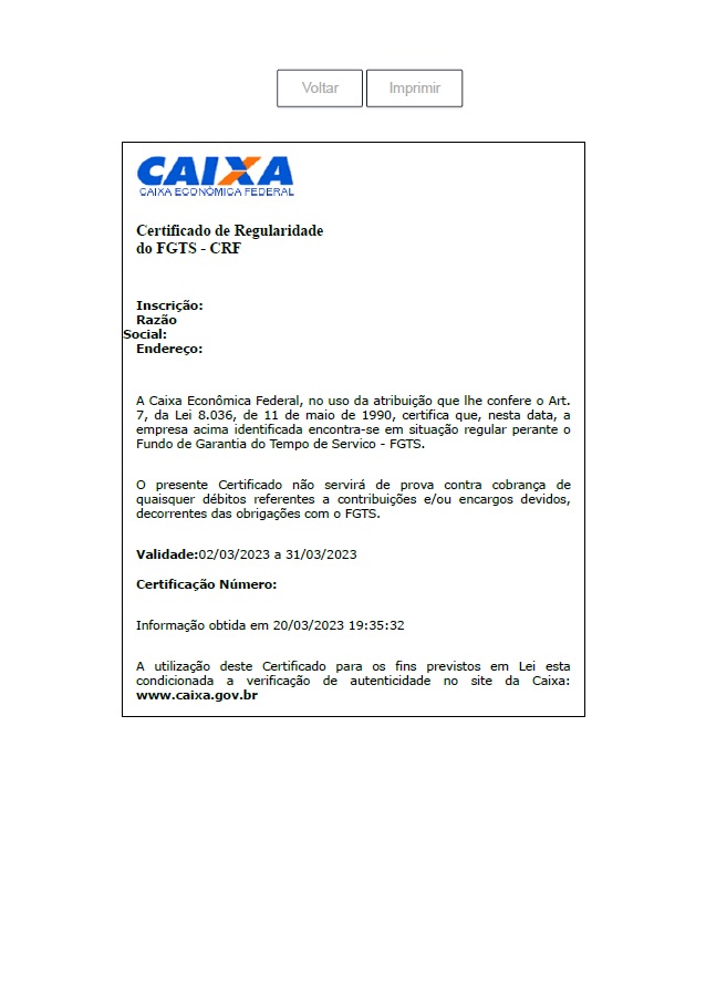 Segue abaixo o modelo da Certidão Negativa do FGTS e as informações que devem conter: