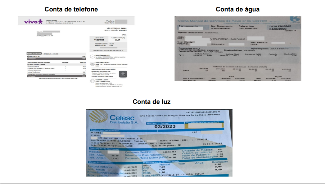 É necessário que no comprovante contenha nome completo do titular, data de emissão vencimento/vencimento recente (no máximo dos últimos 90 dias), nome da rua completo, número, bairro, cidade, estado e CEP válido.