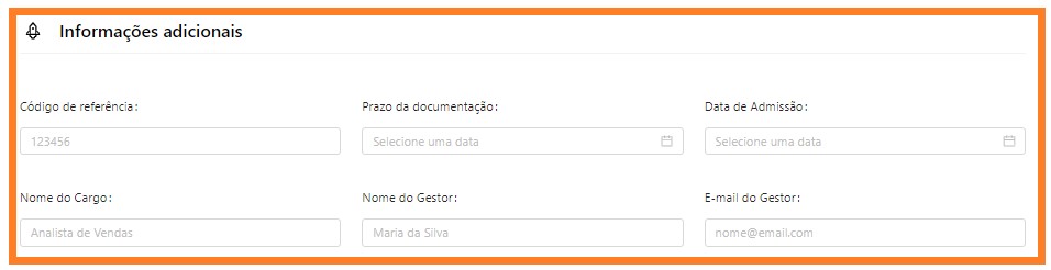 - Logo abaixo temos os campos de informações adicionais como, o prazo da documentação (essa informação é muito importante pois chegará para o candidato como um alerta), os demais dados são opcionais código de referência (caso queira localizar o candidato através de algum código interno da vaga), data de admissão, nome do cargo, nome do gestor e e-mail do gestor, portanto não tem problema se ficarem em branco.