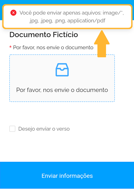 Os formatos de arquivos aceitos pela plataforma, são: jpg, jpeg, png e pdf. Qualquer outro formato de arquivo será rejeitado e, em seguida, disparada uma mensagem de erro demonstrada na imagem a seguir: