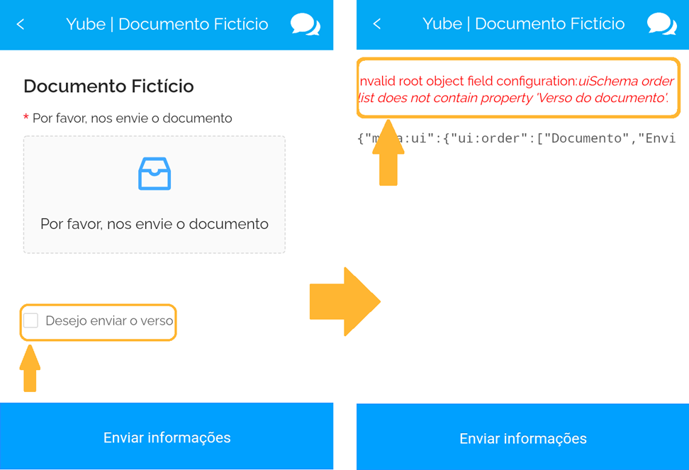 Usando como exemplo a opção “Desejo enviar o verso”. Observe abaixo, que ao marcarmos a opção que nos permitiria enviar o verso do documento, um erro foi disparado: