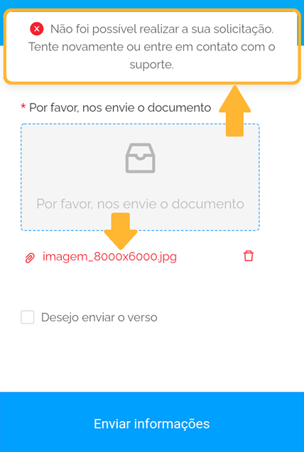 Outro ponto que precisa ser reforçado, é sobre a resolução de fotos/imagens. As fotos/imagens enviadas devem ter uma resolução máxima de 6000x6000 (equivalente a 36 megapixels), caso ultrapasse esse valor, o envio desse arquivo ficará em estado de loading (carregando), e em seguida, a plataforma trará um alerta de erro.