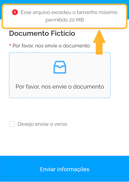 Além disso, há um limite para o tamanho desses arquivos, sendo de 20MB (por arquivo ou no total, quando o campo permitir múltiplos arquivos). Ao tentar enviar algum arquivo que exceda o limite, será exibida uma mensagem de erro: